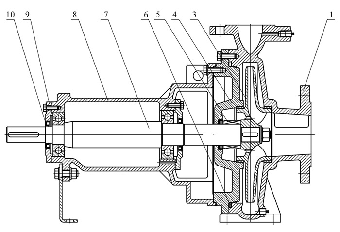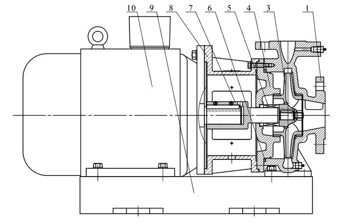 泵為非自吸、單級(jí)單吸臥式,軸向進(jìn)水,徑向出水, 泵體底部與底座固定。