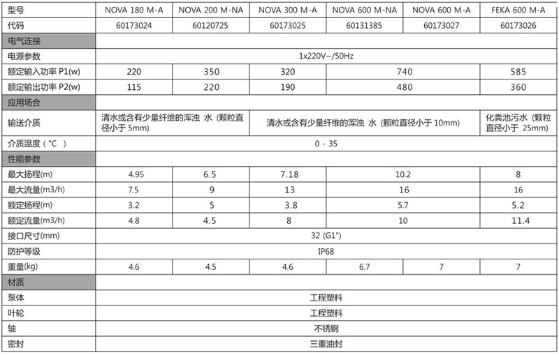 NOVA系列潛水泵主要設(shè)計(jì)用于固定式家用排水,適合清水或無纖維或有少量纖維的渾水等介質(zhì),可普遍應(yīng)用于從水箱或河流中提升水,放泳池、噴泉、坑道、地下通道、地下室和車庫積水等場合。因其緊湊的結(jié)構(gòu)和易于操作的特點(diǎn),也可用作應(yīng)急手提泵適用。FEKA600系列污水潛水泵主要設(shè)計(jì)用于提升污水池內(nèi)的污水,也可配合我們的污水泵站FEKABOX和FEKAFOS使用,可排放*大尺寸為25mm的懸浮顆粒。