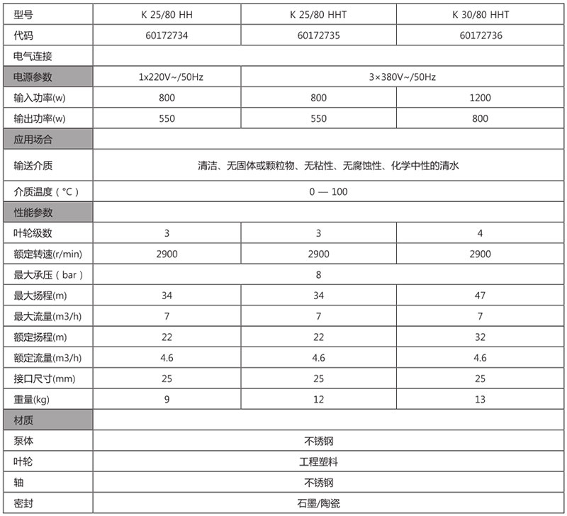 產(chǎn)品特點(diǎn) AISI304不銹鋼泵體、端蓋及轉(zhuǎn)子軸、外觀美觀,使用壽命長(zhǎng);接線盒防護(hù)等級(jí)IP55,電機(jī)防護(hù)等級(jí)IP44,絕緣等級(jí)F;帶有埋入式熱保護(hù)器和啟動(dòng)電容,運(yùn)行噪音低;多級(jí)葉輪,高揚(yáng)程,24月保修期;