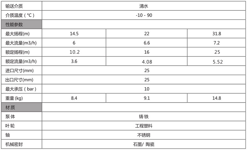 電機(jī)符合CEI2-3標(biāo)準(zhǔn),CCC標(biāo)準(zhǔn),**節(jié)能;自潤(rùn)滑密封軸承,確保電機(jī)靜音運(yùn)行,有效延長(zhǎng)壽命;埋入式熱保護(hù)器在電機(jī)過熱時(shí)停止運(yùn)行,有效保護(hù)電機(jī);高聚合葉輪,精度高、確保運(yùn)行穩(wěn)定性和**性;泵體經(jīng)電泳處理,不 易生銹,耐腐蝕,24個(gè)月質(zhì)保期。